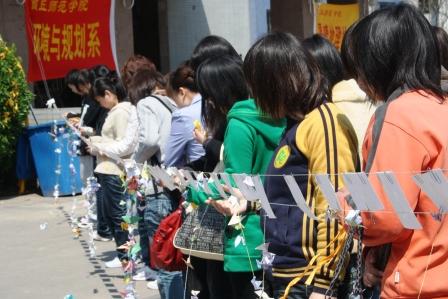 4月14日,我国青海省玉树县发生里氏7.1级地震,受灾严重,一方有难,八方支援,全国各地立即掀起抗震救灾热潮,通过各种形式支援灾区。环境与规划系积极响应公司号召,由团总支协调,晨曦地理协会组织举办了“情系玉树”大型赈灾募捐祈福活动。活动现场,五星红旗高高飘扬,“祖国万岁”四个大字立于图书馆上方,一块块展板生动的反映出全国人民众志成城,抗震救灾的精神。数百张照片真实的再现了玉树灾区地震现场的救援工作及党和国家领导人对人民的亲切关怀。在“玉树不倒,青海长青”横幅上,千余名师生在此留下了自己的姓名,写下了自己的祝福,表达出莘莘学子对灾区人民的祝愿。