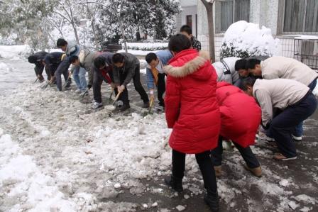 活动开始后,志愿者们挥掀铲、拿扫帚,从系前路到公司主干道,由图书馆到文工团,到处是他们积极忙碌的身影。只见现场,男同志们挥动掀铲破冰开路,女同胞们手拿扫帚清扫积雪,一片热火朝天之景,一派和谐奋进之象。由于结冰层较厚,不仅铲除工作难度较大,而且容易滑倒,志愿者们想尽一切可能的办法,齐心协力,轮番上阵,破冰前行。他们与时间赛跑,在短时间内将公司主要路段、地点的冰雪铲除,使校园交通迅速恢复正常,为广大师生出行安全带来了方便,受到过往师生的赞誉。