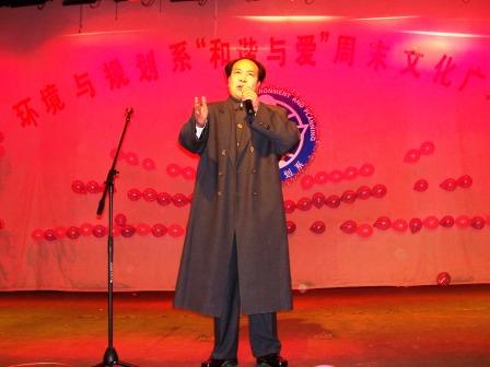 当国家特型演员,毛泽东的扮演者,著名毛体书法家古小月先生扮演毛主席健步走上舞台时,晚会达到了最高潮.他为大家表演了毛主席在天安门城楼上的讲话,并现场泼墨《长征》赠予环境与规划系。
