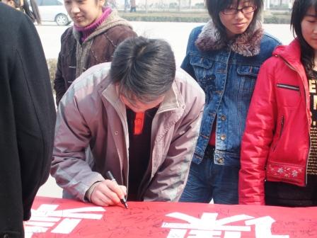 下午三点,短暂的启动仪式过后,参加这次活动的同学便带着劳动工具,来到此次活动的目的地--一号综合楼。经过近两个小时的辛勤工作,近百名同学让这里桌椅的面貌焕然一新,同学们都露出了会心的笑容。为了巩固劳动成果,次日,晨曦地理协会还在图书馆前举办了"向课桌文化说不"的大型签名活动,吸引了众多同学参加。