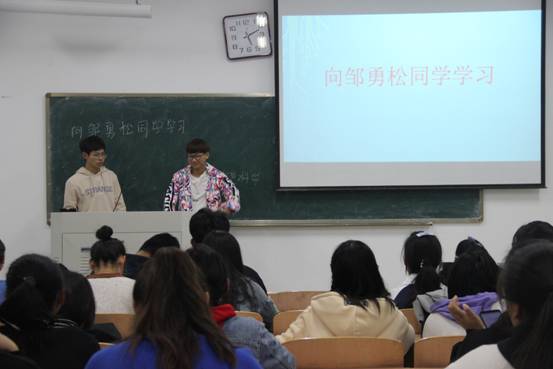 首先,团支书向同学们介绍了邹勇松的基本情况和感人事迹,使同学们对他的优秀精神品质有了初步认识。随后,通过播放视频的形式向同学们展现了邹勇松艰辛的日常生活,他认真踏实的生活态度,坚毅勇敢精神品质,使同学们深刻意识到作为新时代青年应不忘初心、砥砺前行,时刻谨记自己的使命。紧接着,着重讲述了邹勇松所取得的优异成绩和科研成果,同学们纷纷对他表示由衷地敬佩。最后,团支书勉励同学们积极学习邹勇松乐观的生活态度、永不言弃的顽强奋斗精神,并在工作学习中奋发向上,勇于实践。