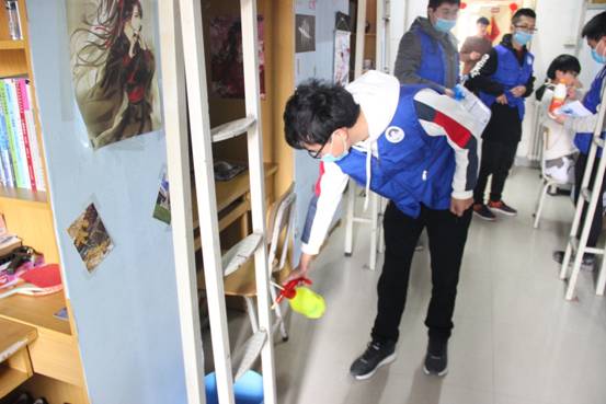 参加消毒活动的同学在25号楼下集合,他们手提消毒喷雾壶,装备齐全,组成三只小分队分别前往院员工宿舍楼进行清扫消毒工作。进入宿舍楼之后,他们有礼貌地敲开员工宿舍门,在取得对方的同意下,对员工床下、桌椅、洗手池、墙脚等各个角落进行消毒清理工作。在消毒过程中,他们分工协作、井然有序,显出了饱满的热情和积极的态度,并同时嘱咐和提醒同学们要及时地开窗通风,做好消毒后期的处理工作,保持好宿舍卫生,共建文明卫生宿舍。最后,各个小分队在大家共同努力的配合之下,圆满完成了此次预防流感清扫消毒活动。