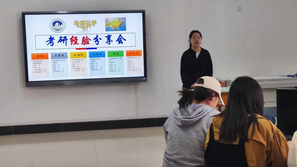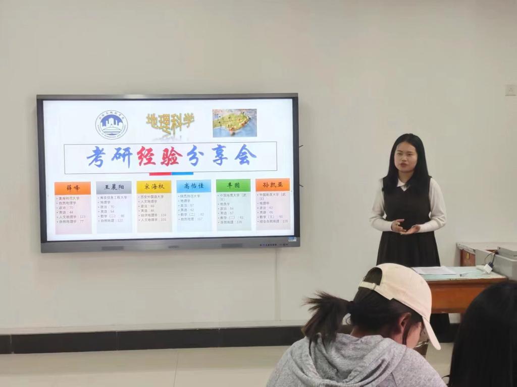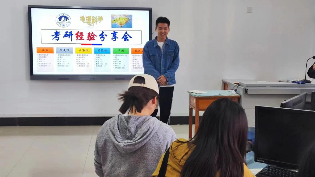 4月16日,地理科学系于三商楼230举办了地理科学考研经验分享会。教师朱新玉、许会道、李治国、邵培、于芳和20级地理科学全体同学参与了这次活动,并邀请了6位考研成功上岸的同学分享他们的考研经验与心得体会。