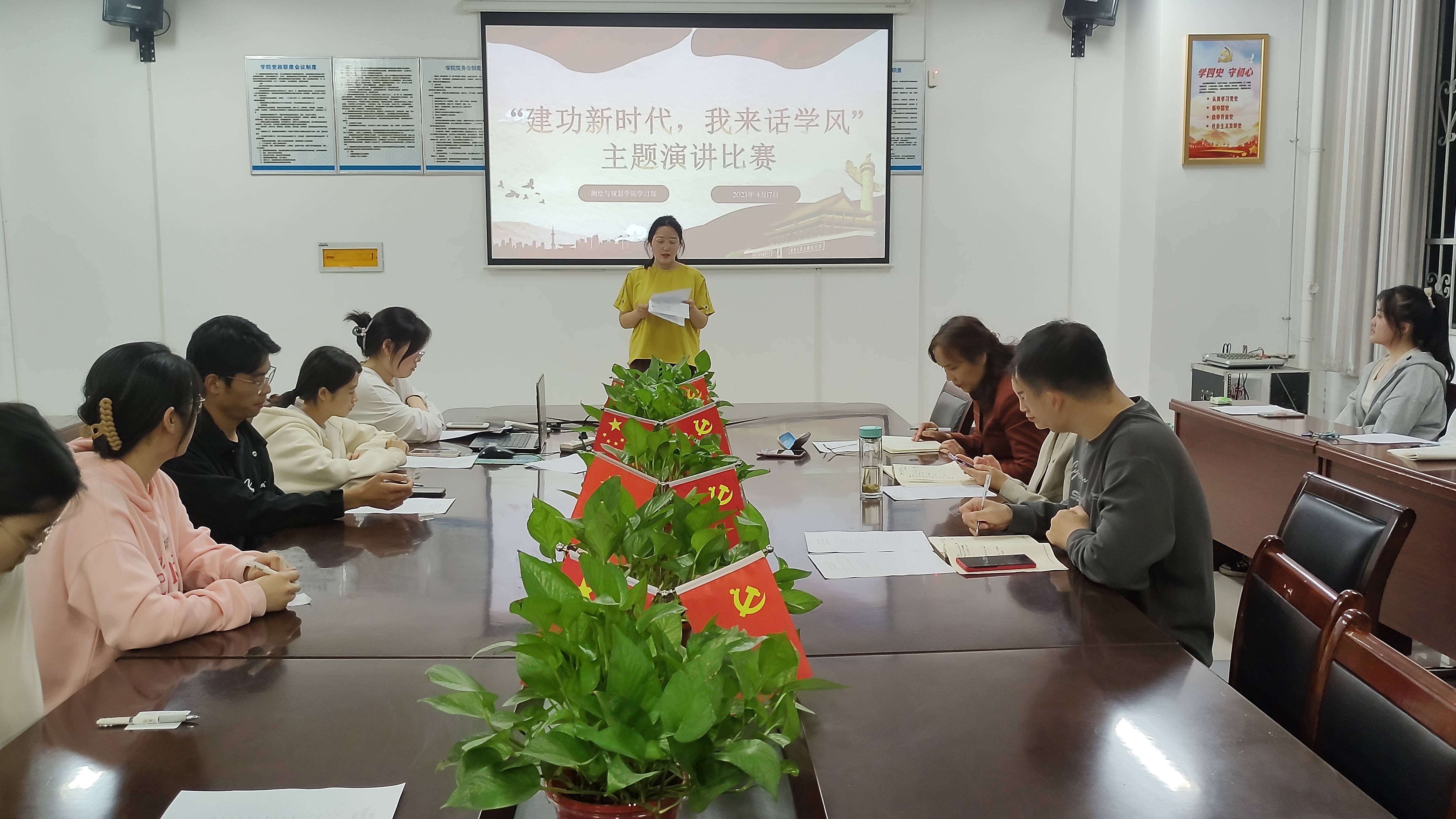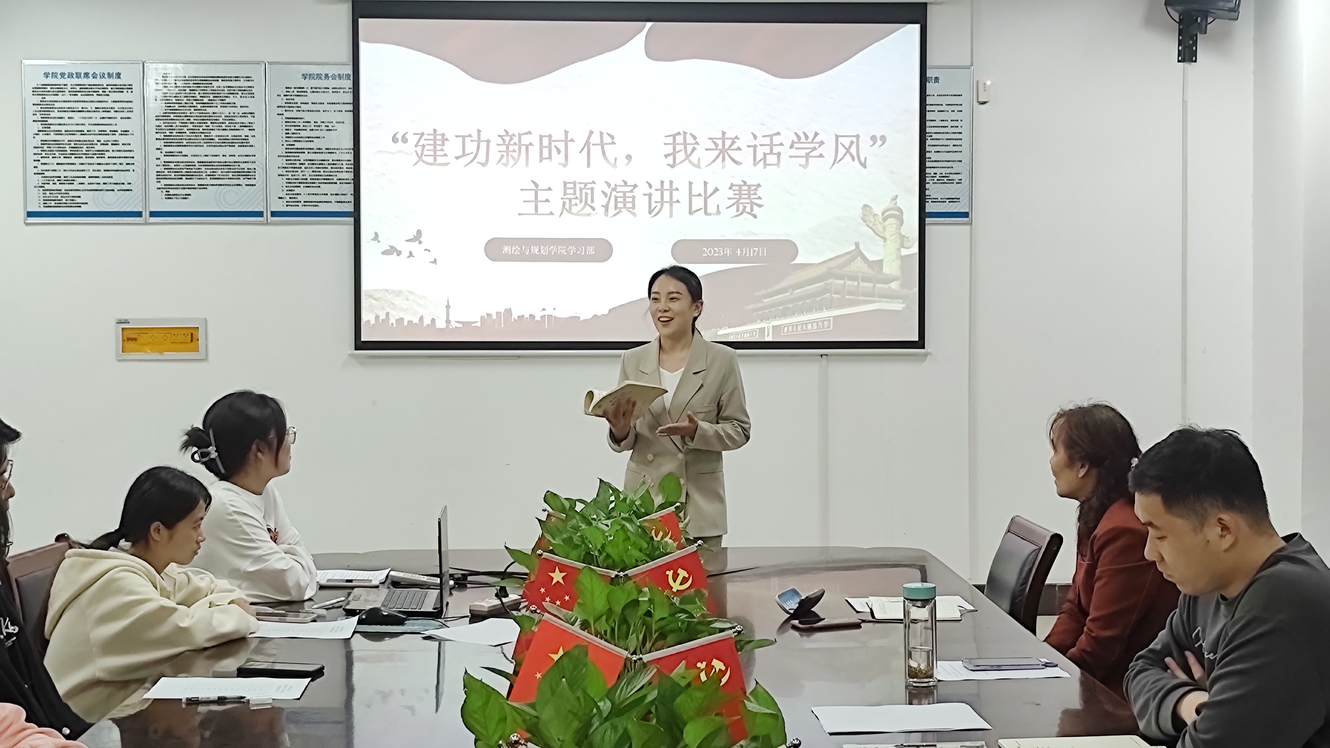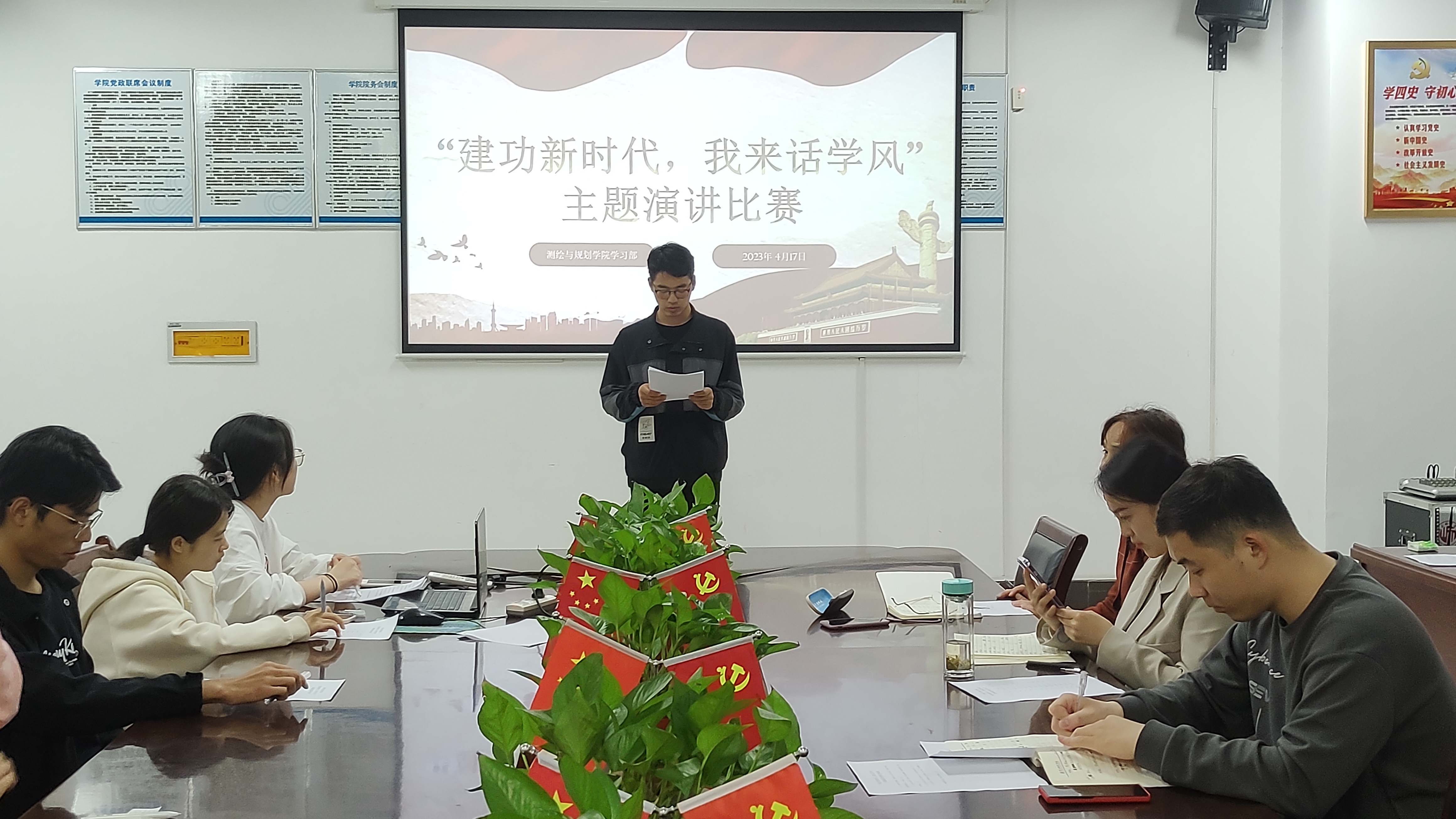 4月17日,beats365官方网站于三商楼134会议室举办“建功新时代,我来话学风”主题演讲比赛。担任本次活动的评委嘉宾有公司党委副书记王丽,2020级辅导员张瑞杰,2022级辅导员王昊昊,以及beats365官方网站学习部的工作人员。2021级和2022级员工代表观看了此次演讲比赛。比赛在同学们的热烈掌声中拉开帷幕。