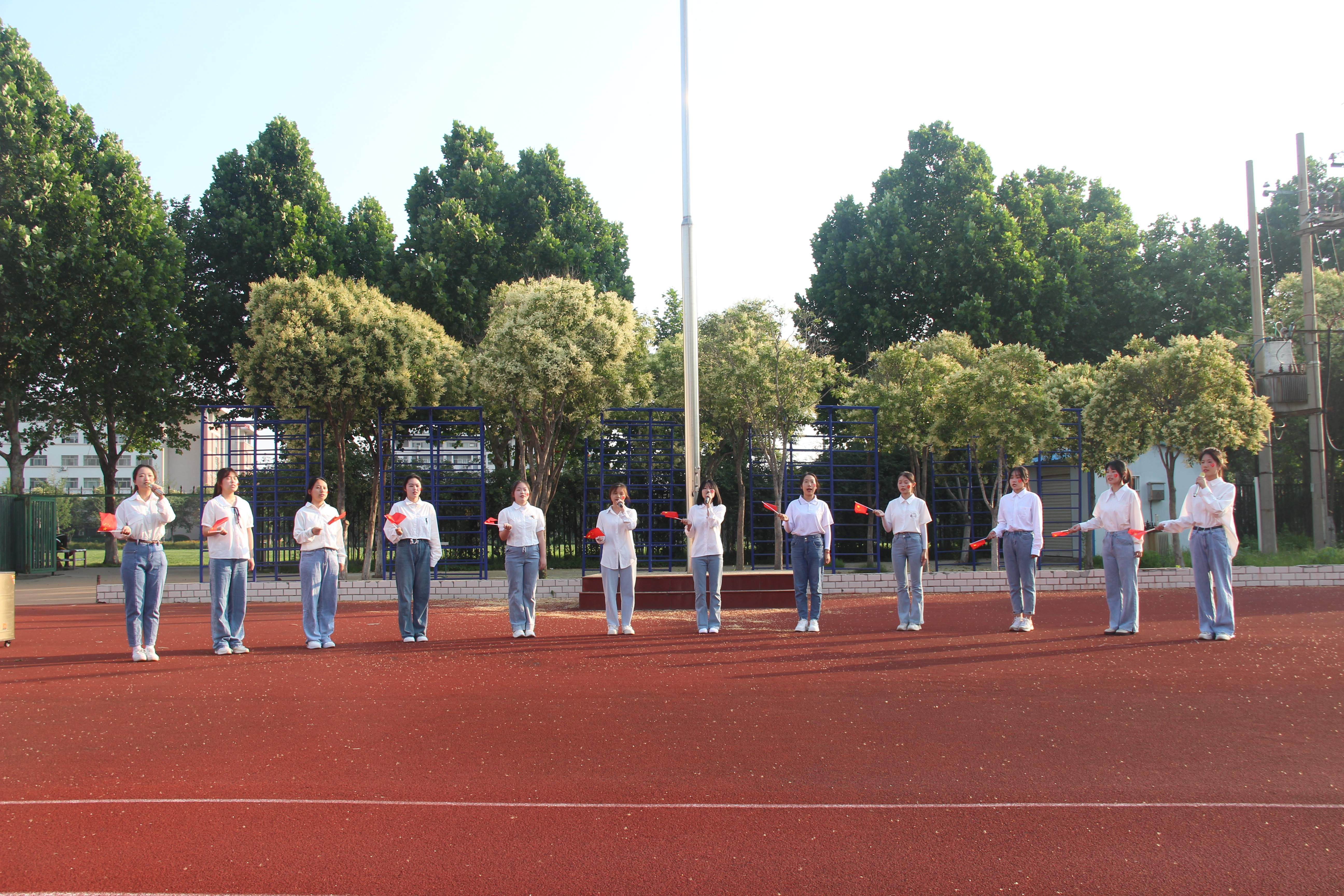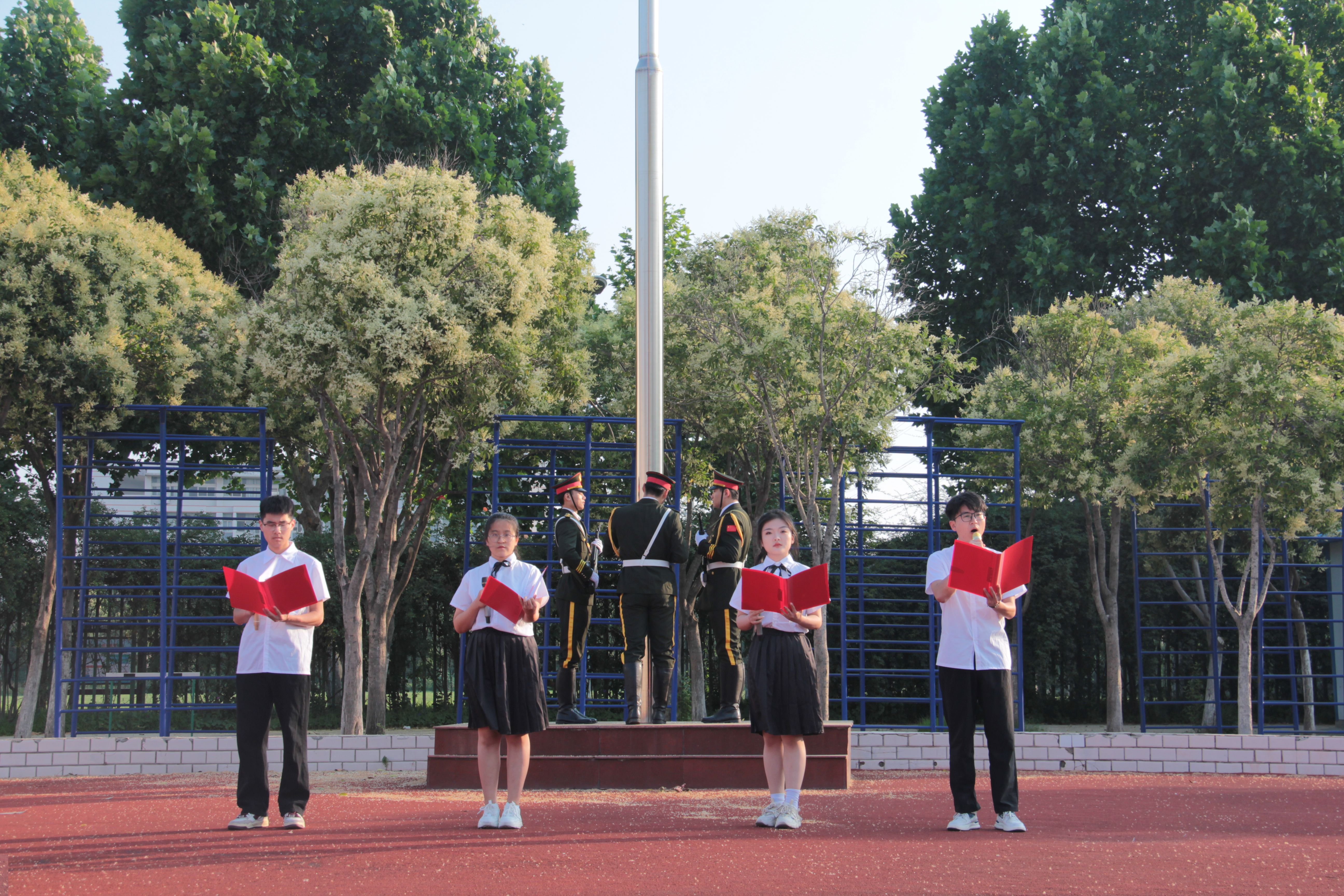 随着国旗护卫队缓步进场,本次升旗仪式正式开始。全场静肃,飘扬的五星红旗在庄严的国歌中冉冉升起,全体人员在朝阳下行注目礼。接着,刘嘉诚、张萱宇、毕凤羽、朱一涵等四位同学为大家带来诗朗诵《青春中国》,高昂的声音传递着文字的力量,抒发着我们无限的爱国情感。随后,2022级员工代表上前演唱歌曲《我们都是追梦人》,风起衣飘,青春活力的歌声中尽显我们逐梦途中的无畏之志。