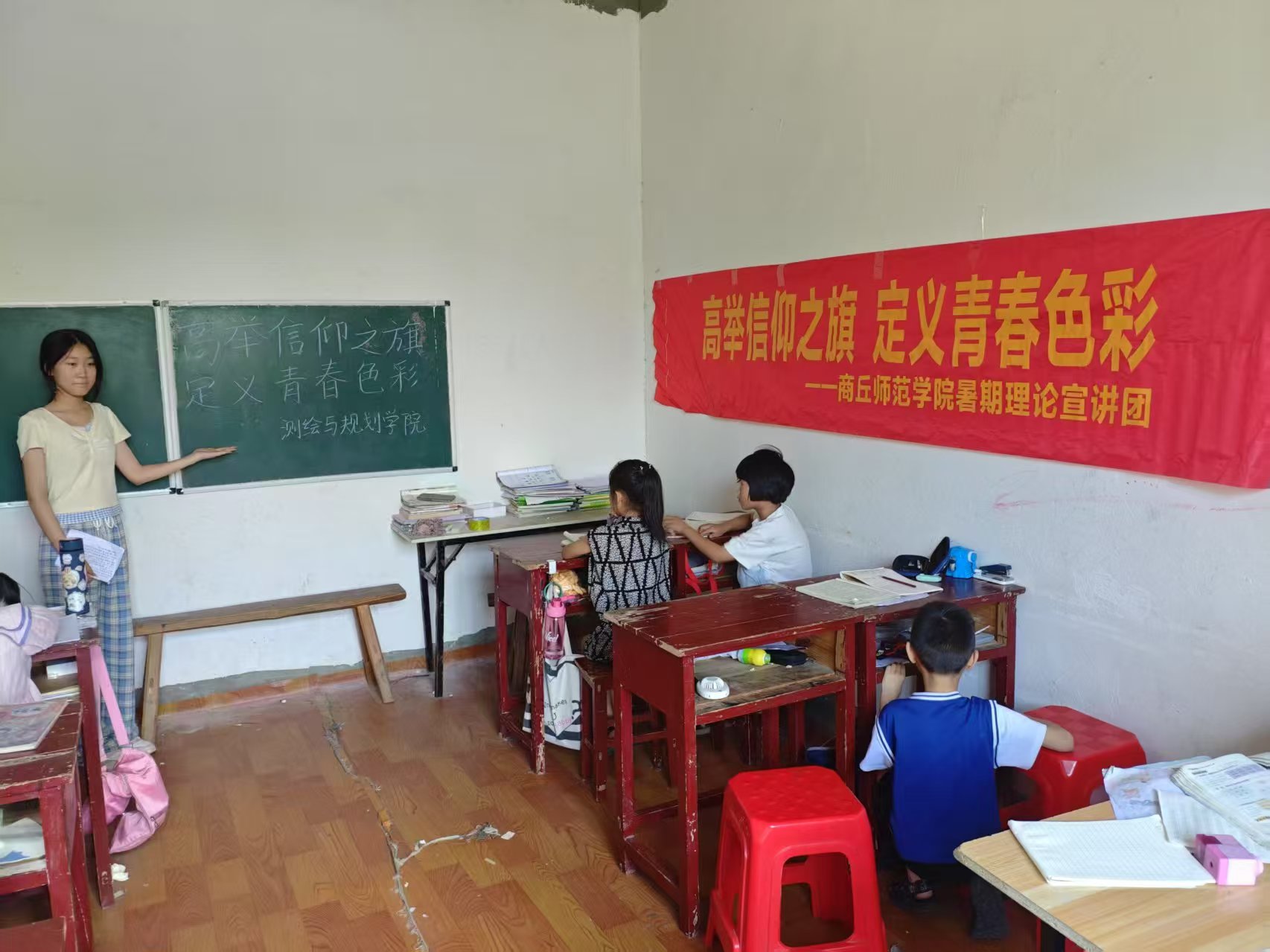 8月4日,宣讲团成员侯子杰前往河北省保定市定兴县七彩阳光青少年艺术培训机构开展理论宣讲,他从“狼牙山五壮士”的英雄故事讲起,传递了民族信仰中的热血与担当,激励同学们要将青春的奋斗融入祖国的建设中去。