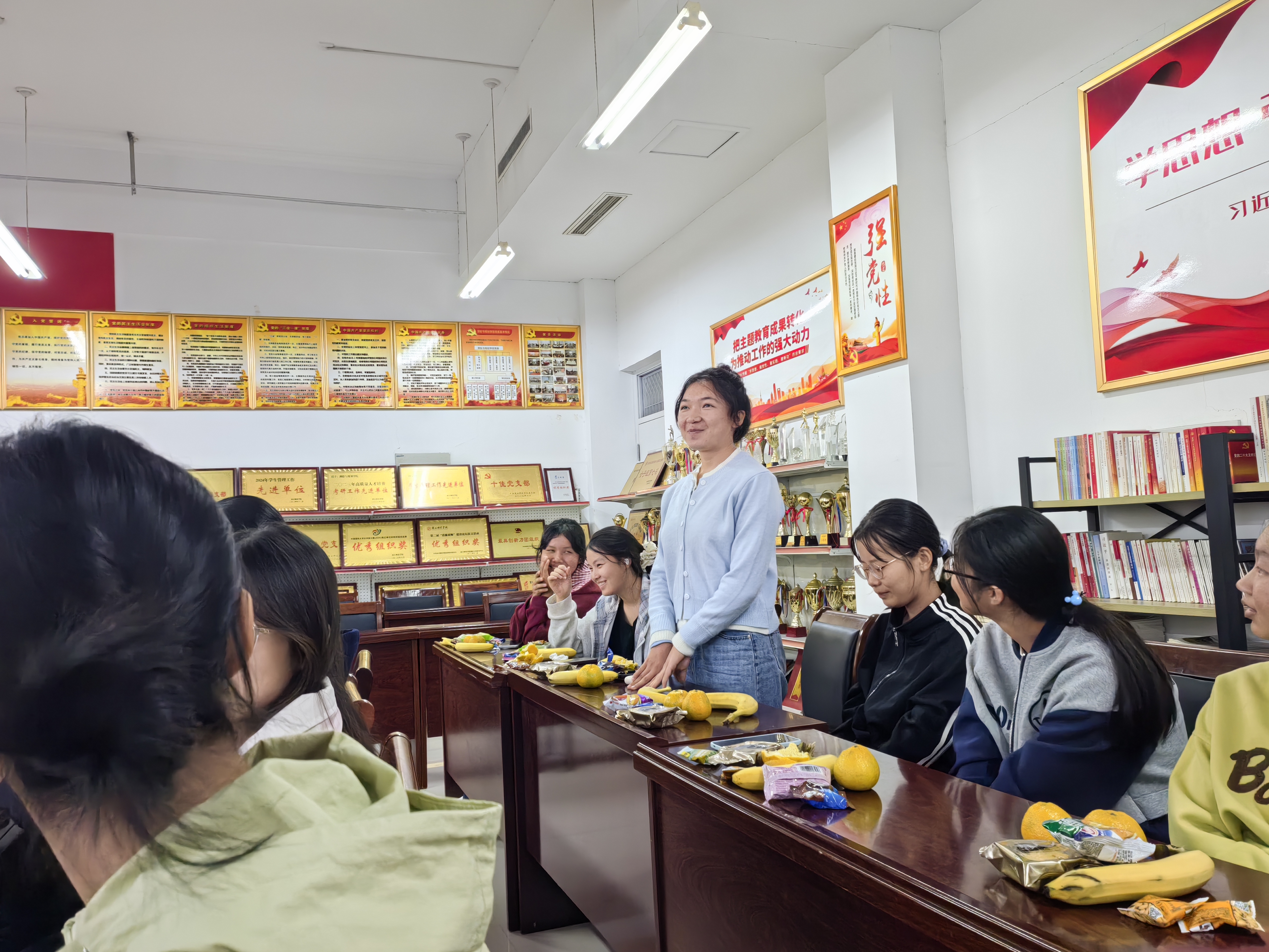 活动伊始,老师们为同学们分发精心准备的中秋月饼、水果、零食等。师生们围坐一桌,一边品尝美食,一边围绕“大学适应情况”“学业规划方向”“日常校园生活”等话题进行交流,新生们主动分享初入校园的感受,老师们耐心倾听并及时回应。
