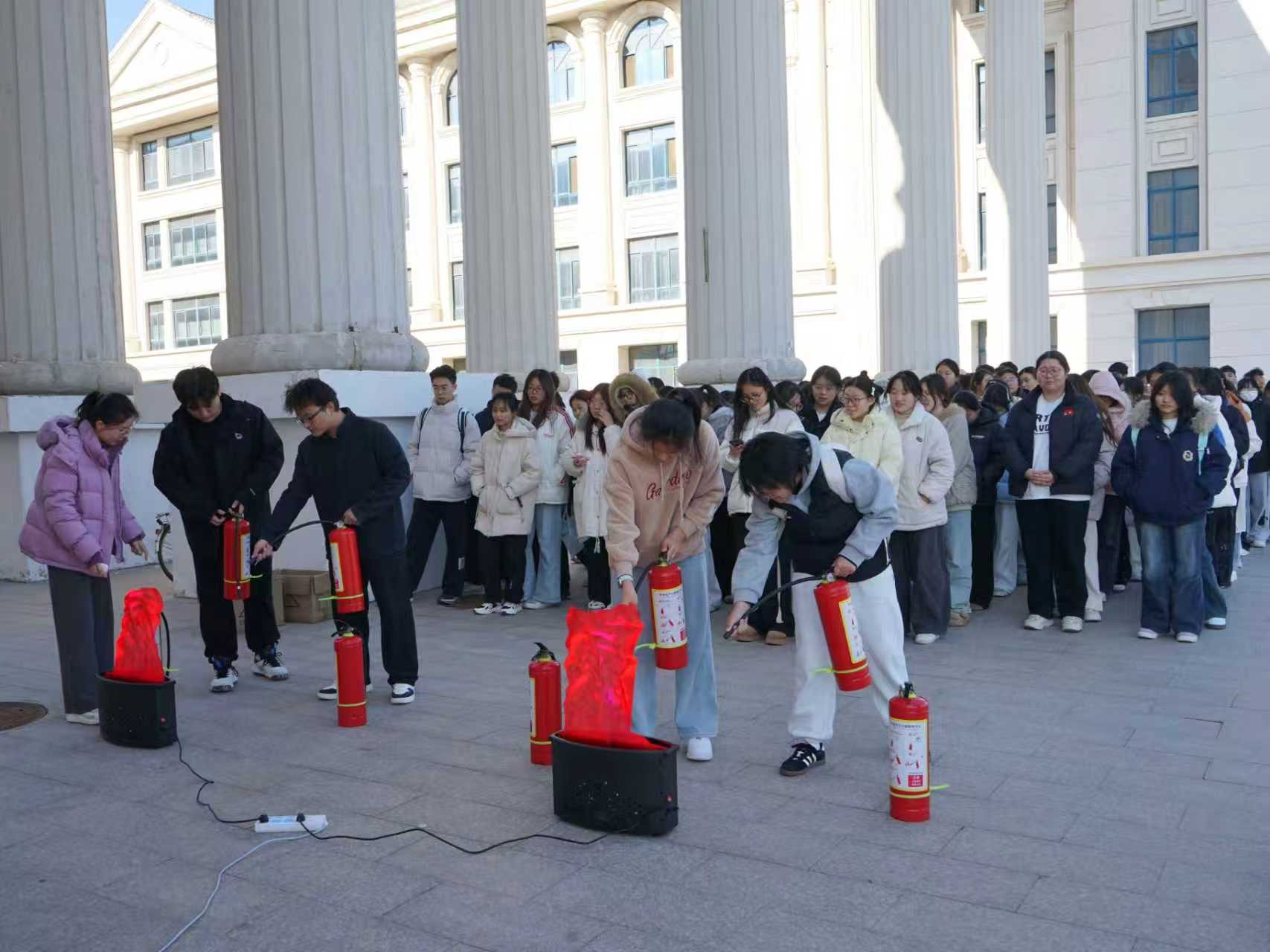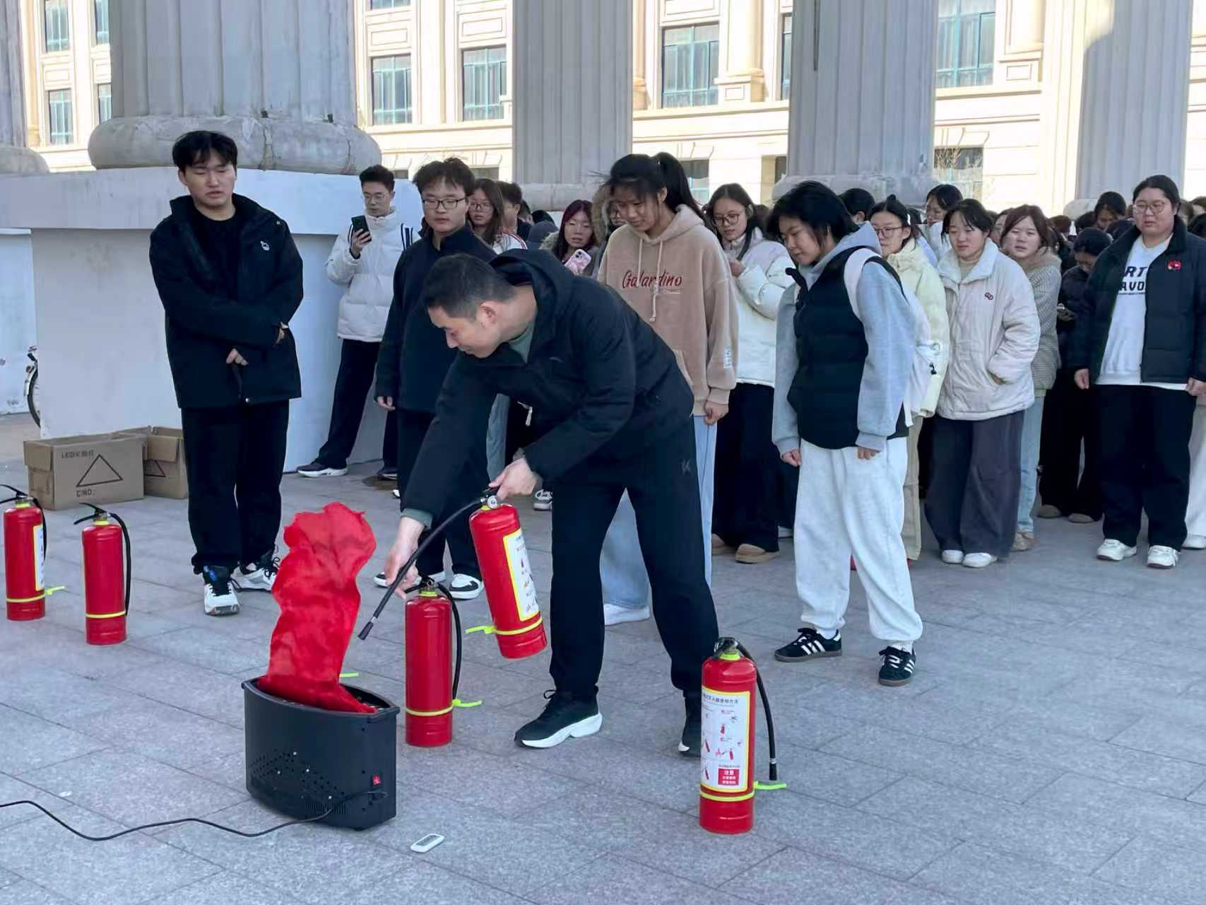 活动伊始,张瑞杰结合校园火灾典型案例,系统讲解了火灾成因、火灾类型划分及各类消防器材的适用场景与操作规范。在实操环节,他示范了灭火器“提、拔、握、压”的标准流程,随后指导员工们逐一上手演练。同学们在灭火体验中掌握了基本技能,既深化了对消防知识的认知,也提升了应急处置火灾险情的信心与实操能力。