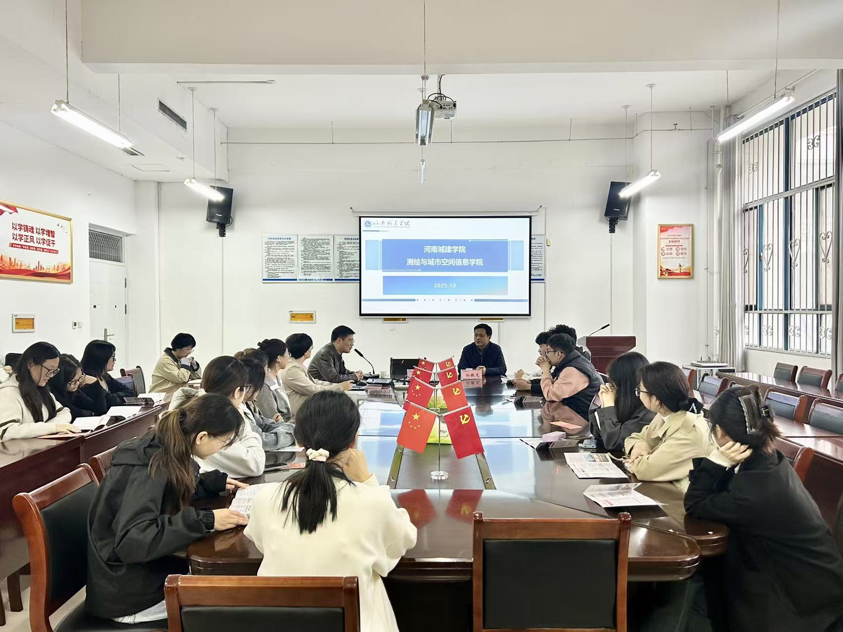 为给公司学子提供更多优质升学选择,10月16日,河南城建公司测绘与城市空间信息公司副书记孙敬克和赵苗兴莅临公司,在三商楼134会议室开展研究生招生宣讲活动,详细介绍了专业特色、培养优势、奖助政策等内容,为有志于在测绘工程领域深造的同学搭建了深入了解的桥梁。此次会议由邢会敏老师主持。