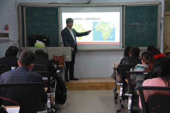 课堂开始,袁孝亭教授先向学员们提出“初中地理教学的主要内容”这一问题,并以此引出“怎么看地理位置”和“怎么看地理分布”这两大课题。随后,他从多个角度向学员们详细明晰地讲解例题、补充知识点并向学员们介绍了认知地理位置和地理分布的四种方法。一是区域划块结合方位进行地理描述;二是借助参照物,用方位名词对位置和分布进行概括和描述;三是注意地理分布的形状识别与归纳;四是整体扫描、局部聚焦的读图方法。接着,袁孝亭对数个国家的地理位置和地理分布进行现场分析,进一步加深了学员们对这四种方法的理解和应用。他指出,地理学科的教学和学习要有一定的逻辑方法,老师要引导员工有“形状”敏感度,逐步完成从死记硬背到理解记忆的转变。最后,他强调,学习一定要进行大量的文献阅读与学理分析,要带着问题深入阅读,从“读”中“悟”出答案,然后“转”化为学习方法。
