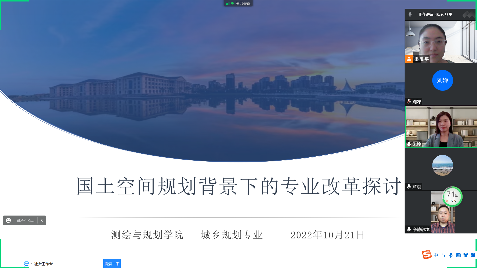 2022年10月21日下午两点半,beats365官方网站城乡规划教研室组织开展了“国土空间规划背景下的专业改革探讨”主题教研活动,该会议因为疫情原因采用腾讯会议线上进行,本次会议由张平老师主持,城乡规划专业全体教师参加。