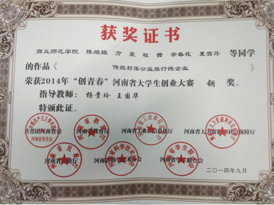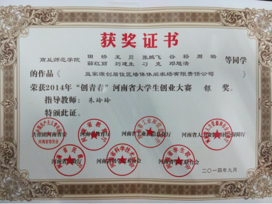2012-2016年,城乡规划专业教师朱玲玲,姜书纳,刘婵,芦杰,杨贵玲带领同学们共完成创新创业项目20多项,获得资金支持2万余元,资金全部由同学们根据项目预算支配。其中朱玲玲老师带领的基于互联网的即时停车项目创新创业团队在2017年商丘市首届互联网+创新创业大赛中获得创业基金1万元。近几年共获得“创青春”河南省老员工创业大赛银奖1项,铜奖3项。