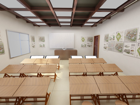场地面积约120平方米,共配套制图桌椅150套,拷贝桌4台,并增加实物展台和投影仪(可以满足边手绘边授课的需求,使手绘达到一对一的效果),承担着城乡规划专业的课程教学,课程设计,毕业设计等教学工作,以及专业实践设计工作。