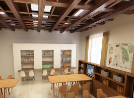 场地面积约120平方米,采用开放式管理,配建自助借阅机、自助打印机方便师生的使用。和一定规模的实践数据库(电子文档、音像资料)等。除了提供专业书籍、规范、图集10000册、专业期刊20种类,配套齐全法规文件和参考设计资料等纸质资料外,采用触屏查询机,提供一定规模的实践数据库(音像资料、电子资料、规划数据库)的阅览。