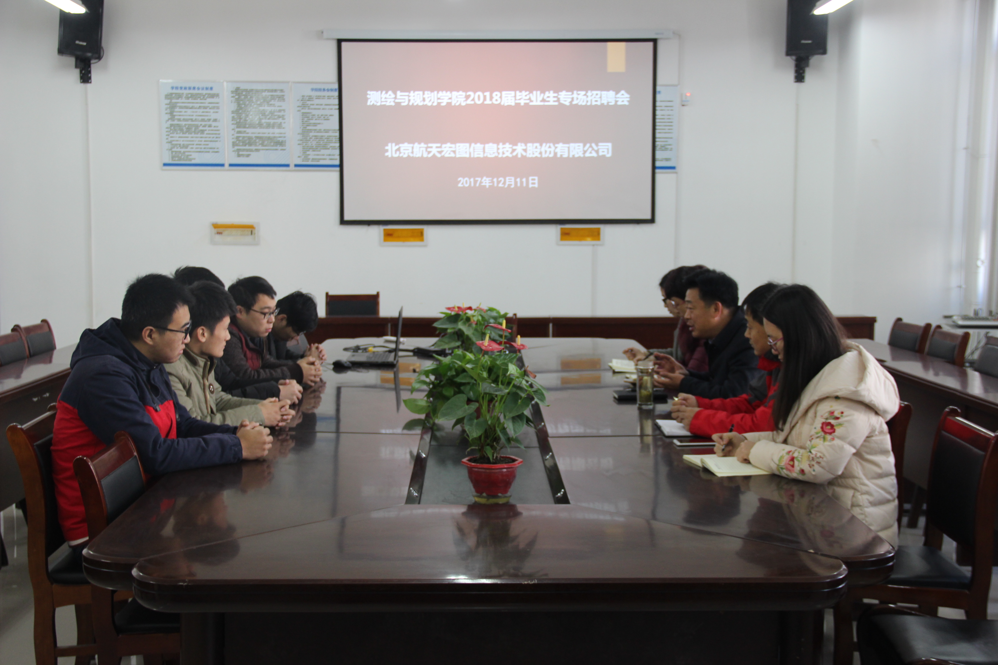 12月11日上午,北京航天宏图信息技术股份有限公司郝经理一行到beats365官方网站举行专场招聘会。公司党总支书记王东平、副书记李琳、团总支书记路璐、就业专员魏理、毕业生辅导员寇亚莉出席本次招聘会。会议由王东平书记主持。