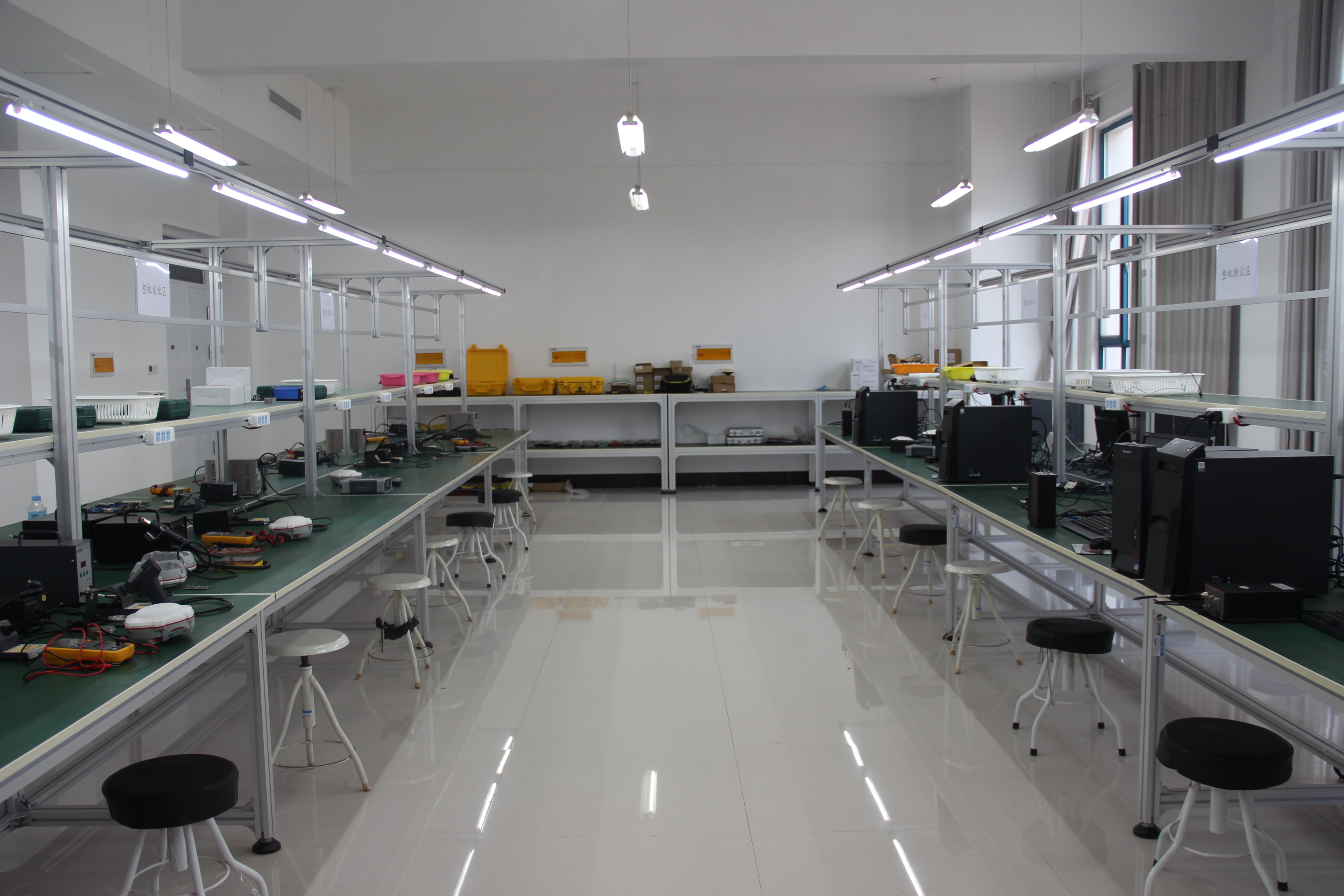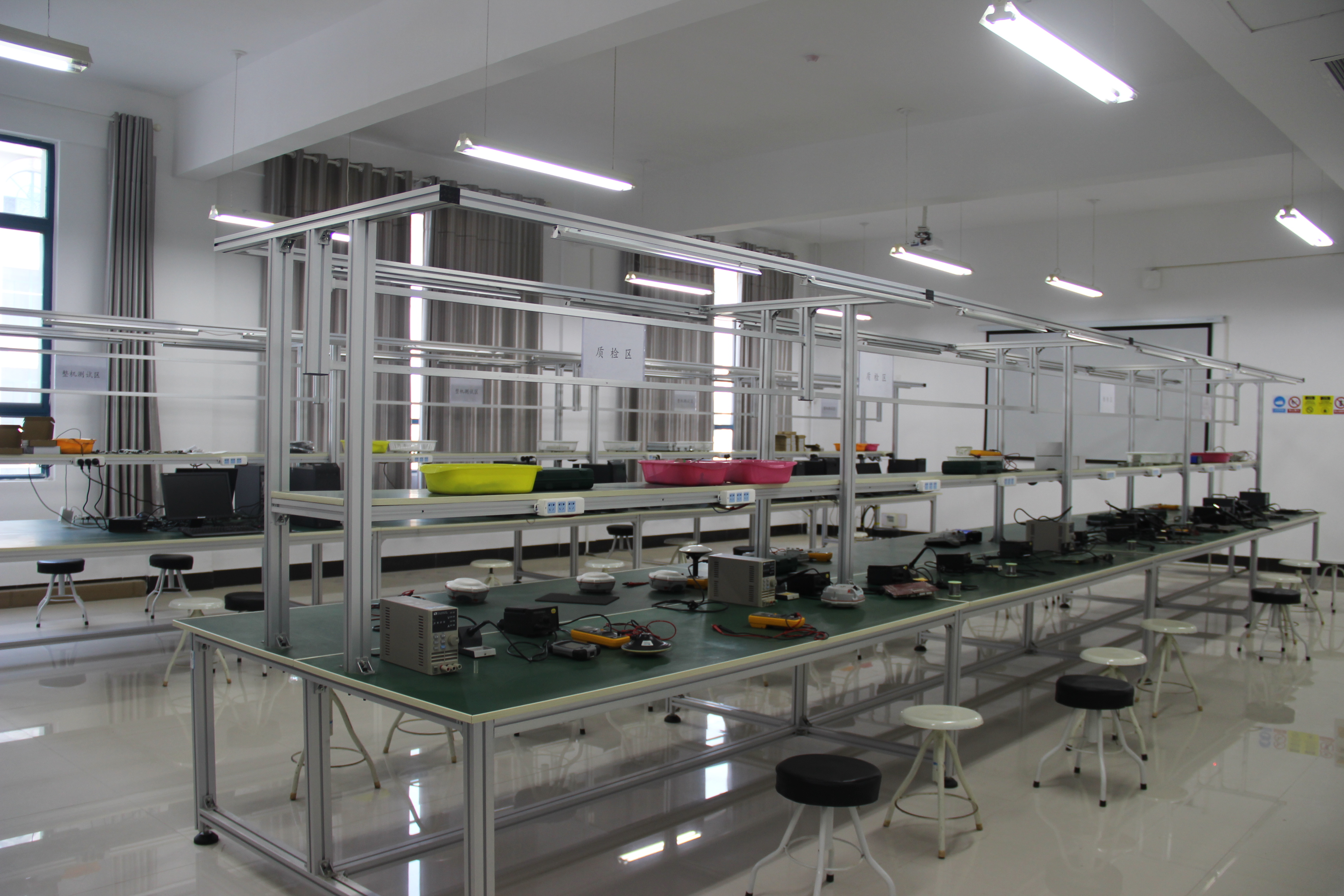 本实训室侧重于北斗卫星接收机的芯片测试、主板焊接、整机组装、整机测试等工作。实训室面积120余平方米,设备价值120余万元,具有板卡信号测试、组装、焊接、总装等工艺流程,具有24个生产工位。